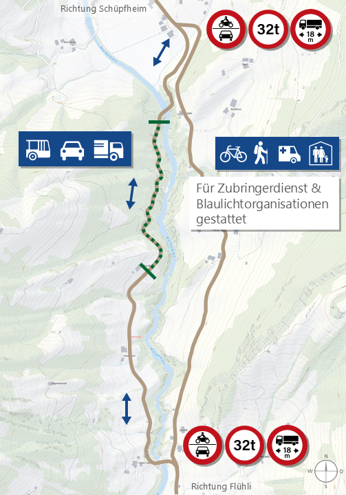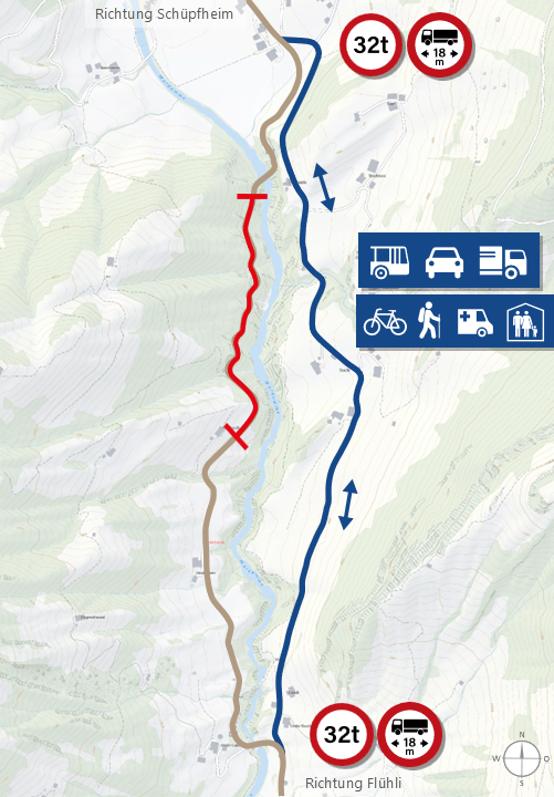 Die bestehende Linienführung in der Lammschlucht zeichnet sich durch eine enge Abfolge von Kurven mit teilweise sehr engen Radien aus. In Kombination mit der bestehenden, geringen Strassenbreite ergibt sich ein unübersichtlicher Strassenabschnitt. Dieser entspricht den heutigen Anforderungen bzgl. Verkehrssicherheit nicht mehr.