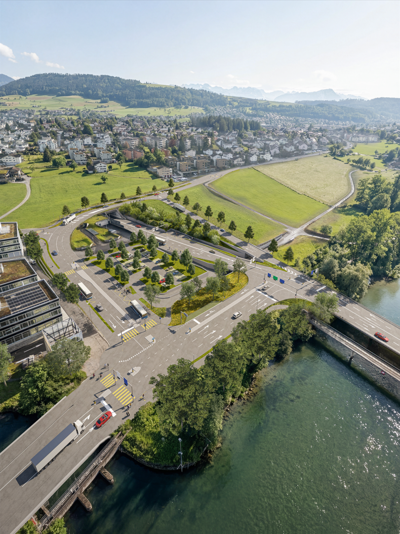 Optimierte Verkehrsführung in Buchrain: Visualisierung der neuen Verbindungsstrasse und der verbesserten Infrastruktur für alle Verkehrsteilnehmenden (Visualisierung: Kanton Luzern/Atelier Brunecky).