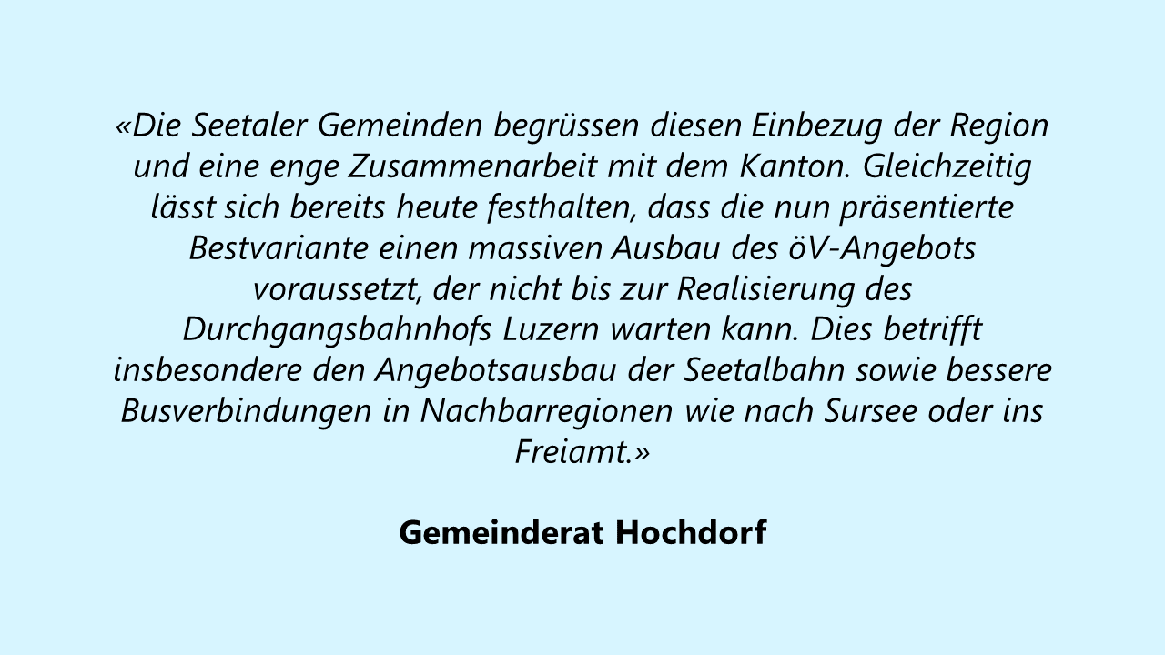 Wesentlich für die Umsetzung der Null+/öV-Varianten ist der Ausbau des öffentlichen Verkehrs, insbesondere die Einführung eines Viertelstundentakts auf der Seetalbahn-Linie, wofür wiederum die Realisierung des Durchgangsbahnhofs Luzern erforderlich ist.