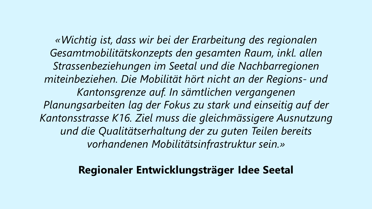 Unter Einbezug aller bisherigen Planungen soll in einem Pilotprojekt ein regionales Gesamtmobilitätskonzept für das Seetal mit Ziel erarbeitet werden. Dies mit dem Ziel die Mobilität gesamtheitlich weiterzuentwickeln, also neben den Kantonsstrassen und der Bahnlinie auch die Gemeindestrassen und alle weiteren Mobilitätsarten einzubeziehen.